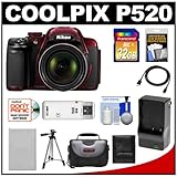 Over Stock Nikon Coolpix P520 GPS Digital Camera (Red) with 32GB Card + Battery & Charger + Case + Tripod + HDMI Cable + Accessory Kit